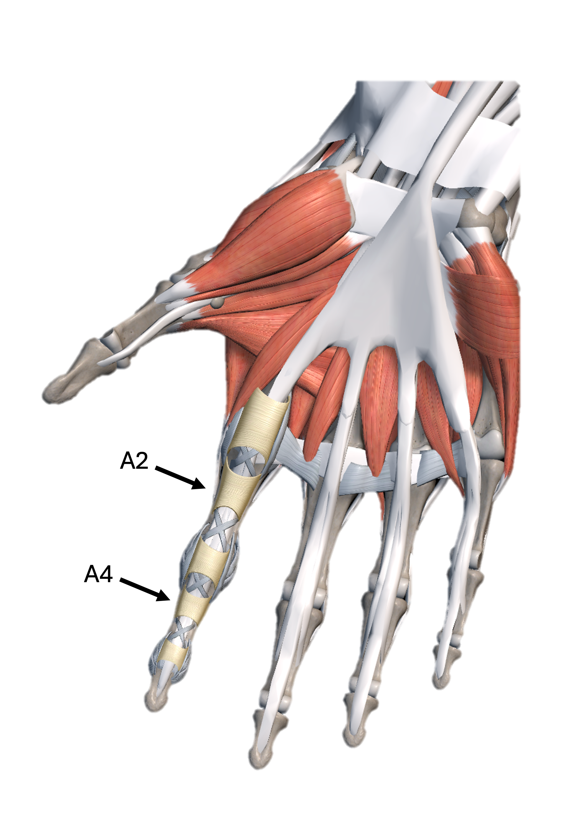These tendons run through a series of fibrous tunnels called annular pulleys (A1–A5) that keep the tendons pulled tight to the bone.