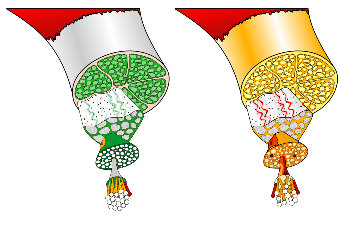 Here you can see on the left, a normal healthy tendon (looks like a fresh climbing rope). On the right you can see a degenerative tendon with rounded fibroblasts, increased ground substance, capillary ingrowth, and disorganized type I and III collagen fibrils (looks like the rope your buddy leaves at the crag all winter so he doesn’t have to hike with it). Learn more about classifying tendon problems here.